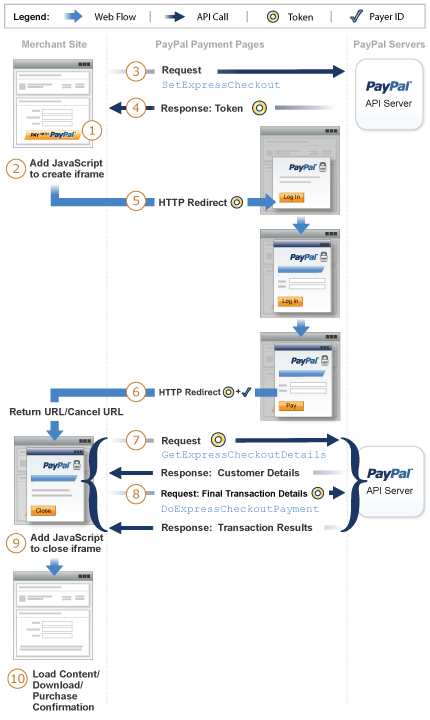 Antes de invocar esta pagina el cliente debe tener relleno el carrito. Mientras se cargaba esta pagina se ha realizado el setExpressCheckout (3). Luego se ha generado el boton siguiente conteniendo el token recibido (4). Al pulsarlo se llamara a PayPal para que se identifique el usuario(5).